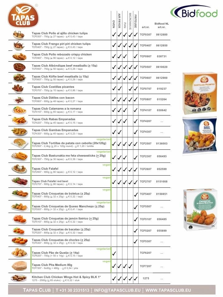 OverzichtEen groot deel van het Tapas Club assortiment is verkrijgbaar bij Bidfood. Hieronder de artikelnummers bij Bidfood.